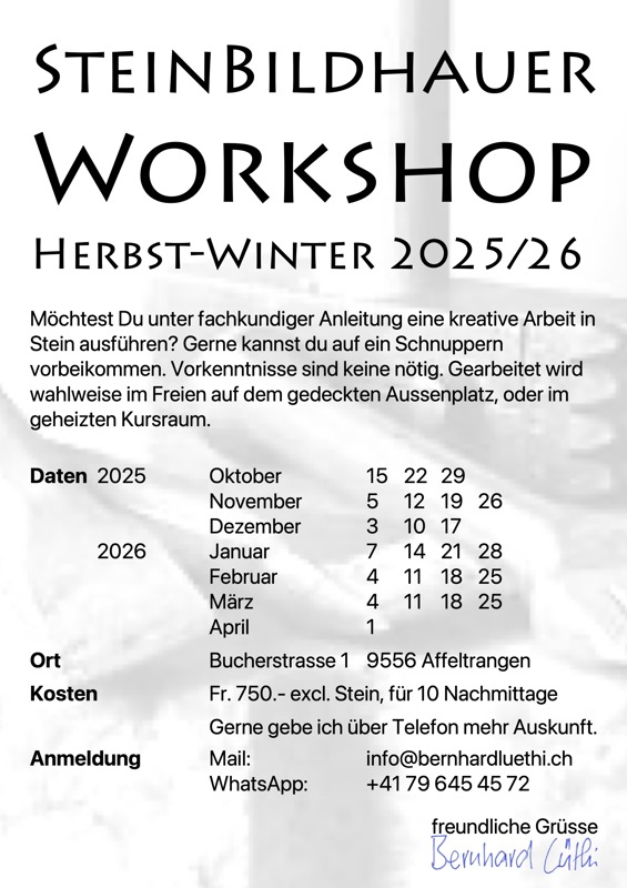 Das ganze Jahr für Personen ohne/mit Erfahrung. Deine Idee wird mit meiner Hilfe in den Stein umgesetzt. Ein Schnuppern ist möglich, gerne zeige ich Dir die Arbeiten & Kursräume.